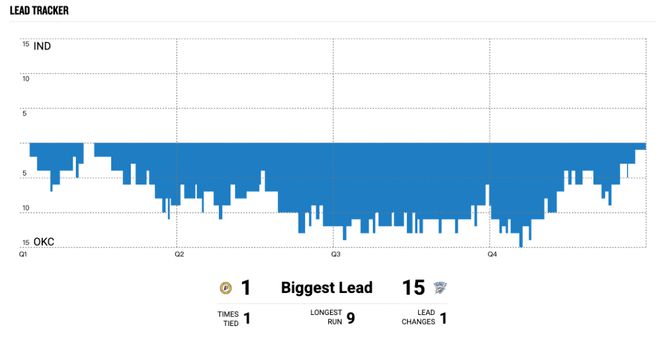 數據告訴我們步行者在俄克拉荷馬客場受盡“欺負”,雷霆前三節完成了12次搶斷,但只有5次失誤,反觀步行者的失誤次數超過對手的4倍,并且搶斷數是0。