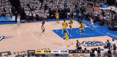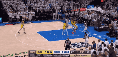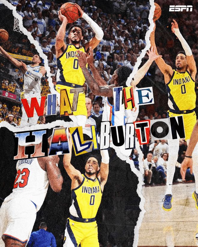 而整整2分38秒的比賽時間只摸了兩次球的哈利伯頓,偏偏又是在最后一個決勝回合,像是雷吉-米勒附體一般,毅然決然地從托平手里要過皮球,頂著防守專家華萊士的纏繞推進到前場,用自己最不擅長、最為別扭的運球急停中投,殺死了比賽,鎖住了雷霆主場球迷原本高聲歡慶的咽喉。