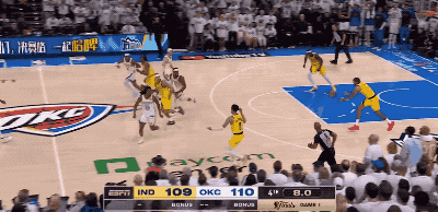 從亞歷山大到多爾特再到替補席的卡魯索,雷霆幾乎能讓整個半場都布滿防守尖兵。步行者球員每時每刻在下球前都要擔心,自己的身側或身后會不會突然閃出來某個穿著藍白衣服的球員,兇狠地把他們的球盜走。