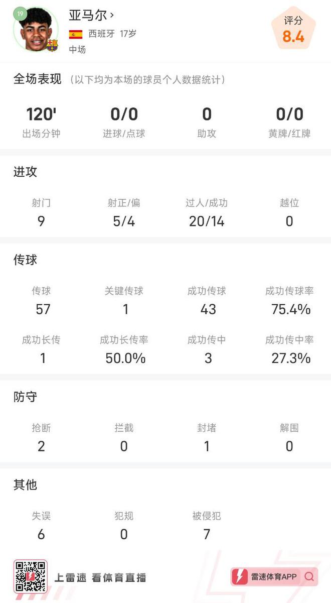 全場比賽,亞馬爾6次失誤,7次被侵犯。
