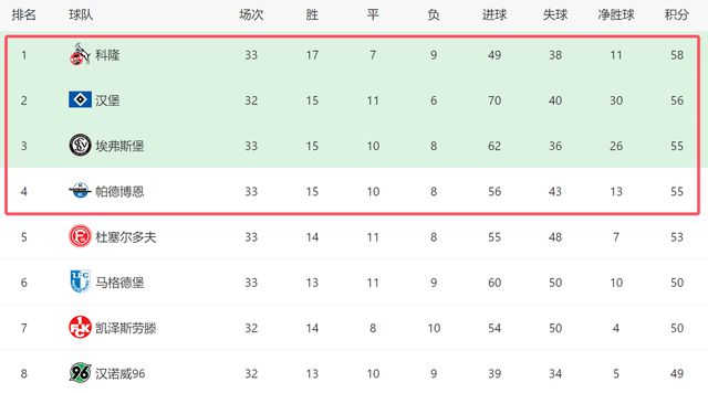 截至目前,德乙爭三形勢更加膠著了。從科隆到帕德博恩,排名前四的4支球隊,如今就差了3分。雖然科隆排名第一,但是他們凈勝球不占優勢,最后一輪一旦輸球,依然存在被擠出前三的可能性。