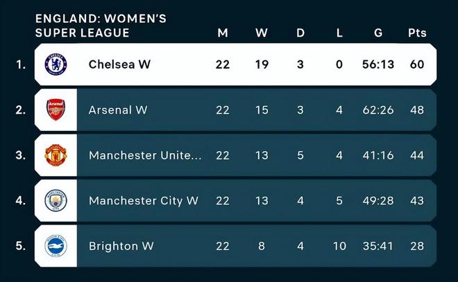 北京時間5月10日英超日報宣報,切爾西女足在主場1-0絕殺利物浦,以創紀錄的60分完成在英格蘭女超聯賽(WSL)不敗賽季奪冠的壯舉。阿森納則以4-3的比分險勝曼聯,確保了聯賽亞軍的席位。