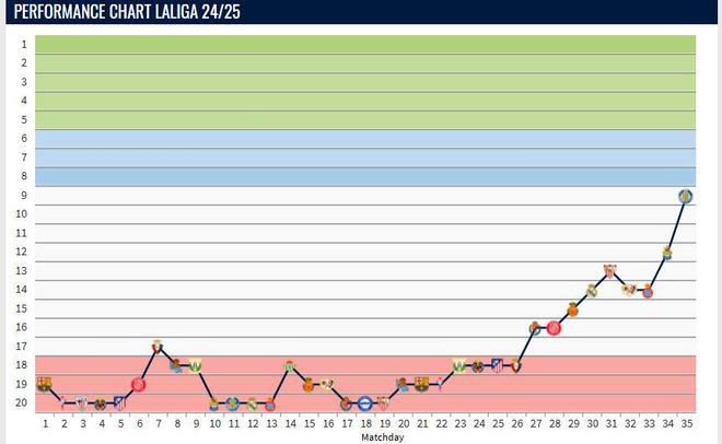 本賽季,瓦倫西亞曾在11輪比賽中排名墊底,看上去降級不可避免,他們最近一次墊底是在西甲第19輪,但在那之后,球隊逐漸擺脫困境,到如今躍居積分榜中上游的位置,瓦倫西亞的表現(xiàn)可謂脫胎換骨。