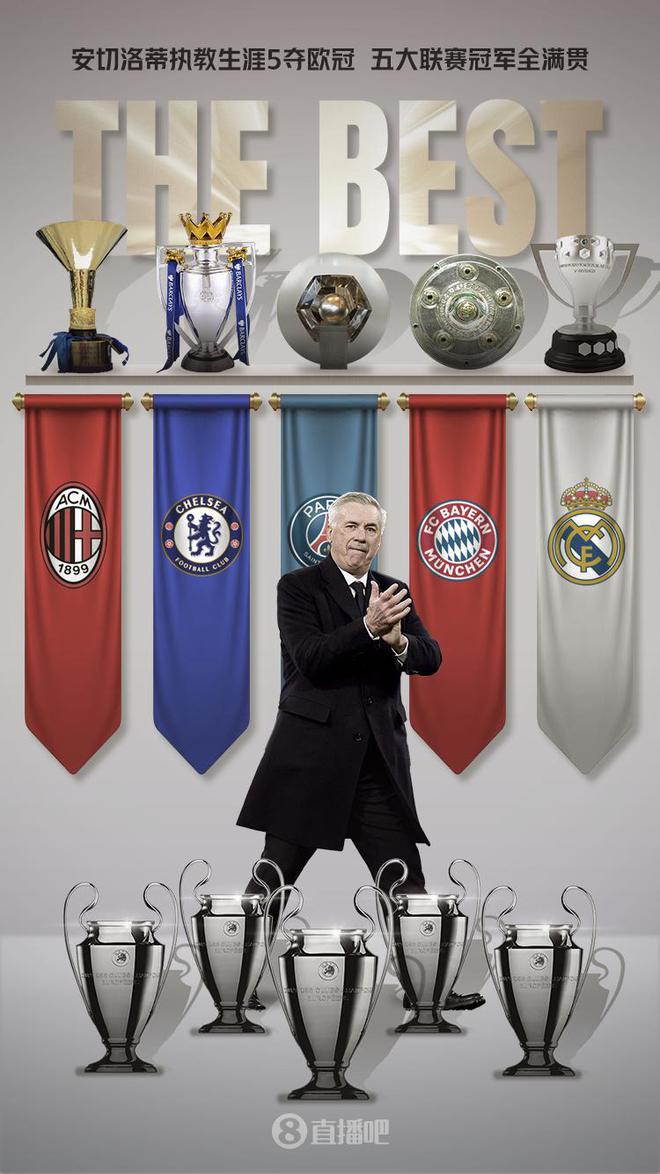 安切洛蒂在五大聯賽,都帶隊奪得過聯賽冠軍,并且生涯帶隊5次奪得歐冠冠軍。