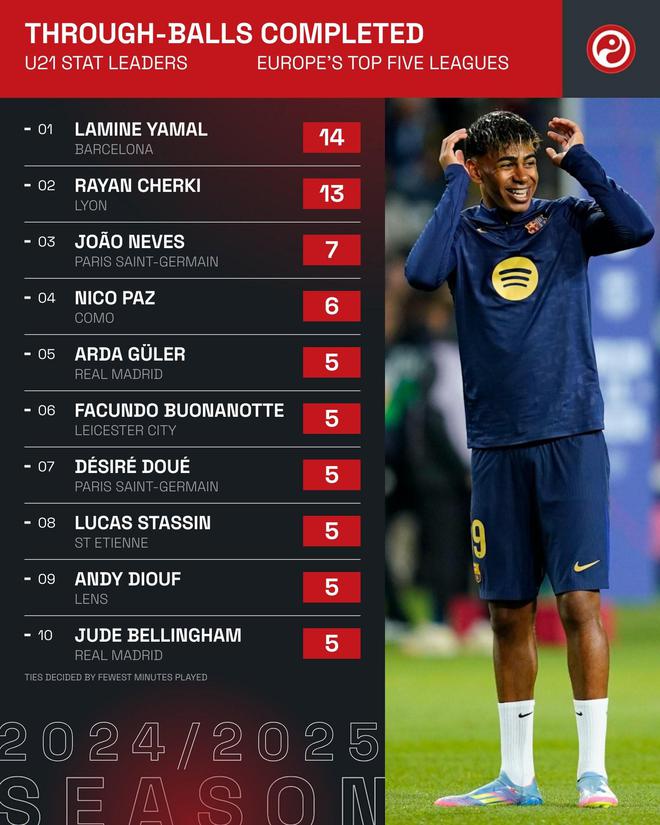 據統計,亞馬爾是本賽季歐洲五大聯賽成功送出直塞球次數最多的U21球員。