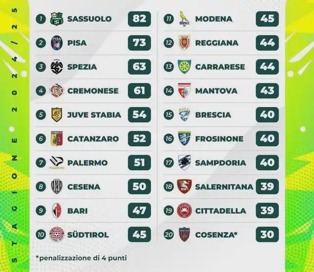 此外弗羅西諾內和薩勒尼塔納這兩支剛從意甲降級的球隊分列第16和第17位,他們將會展開保級附加賽的廝殺。薩索洛則是提前5輪就確定重返意甲,縱使最后2輪輸球他們依然拿下了意乙冠軍;因扎吉帶領的比薩也完成了升級;斯佩齊亞、克雷莫內塞、尤維斯塔比亞、卡坦扎羅、切塞納和巴勒莫分列第3至第8位,他們將會為最后一個升入意甲的名額展開升級附加賽的爭奪。