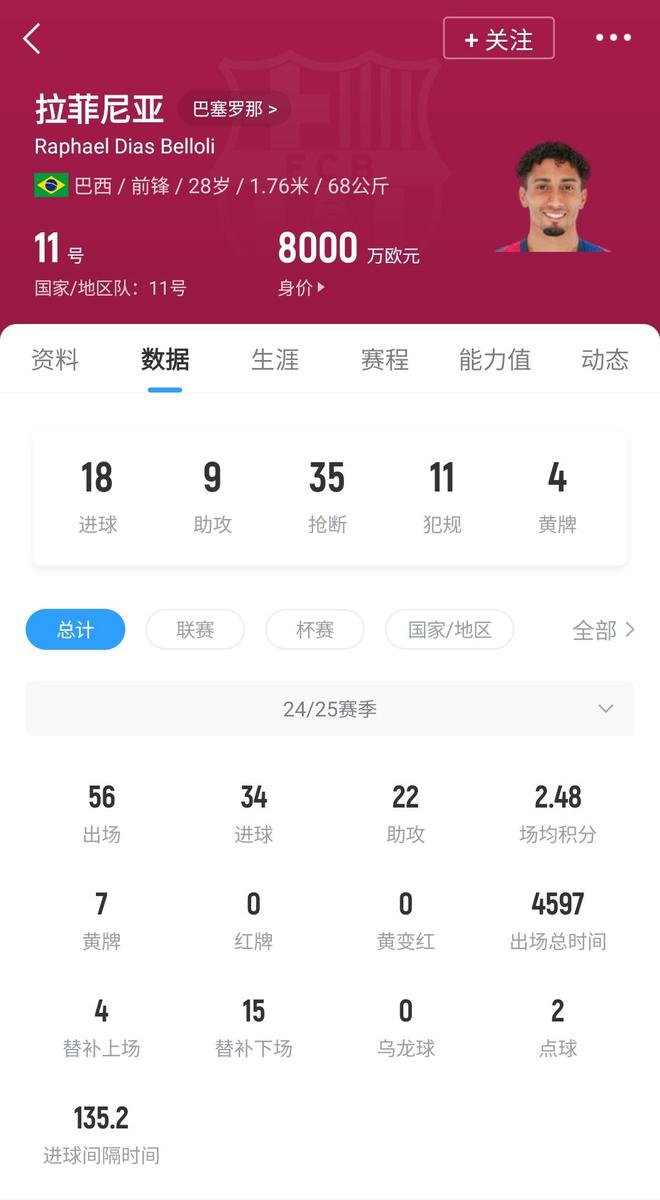 2022年夏窗,巴薩花費5800萬歐轉(zhuǎn)會費從利茲聯(lián)簽下拉菲尼亞。本賽季,28歲的拉菲尼亞為巴薩出戰(zhàn)56場比賽,貢獻34球22助,幫助巴薩拿下西甲、國王杯和西超杯三個冠軍。
