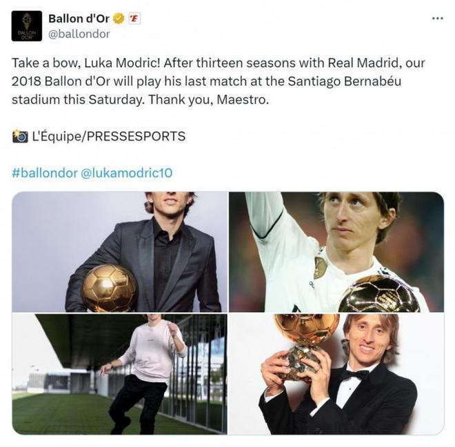 金球獎(jiǎng)官方社媒曬出莫德里奇手捧獎(jiǎng)杯的照片并配文:“致敬謝幕,盧卡·莫德里奇!在皇馬效力13個(gè)賽季之后,我們的2018年金球獎(jiǎng)得主將于本周六迎來他在伯納烏的最后一場(chǎng)比賽。謝謝你,大師。”