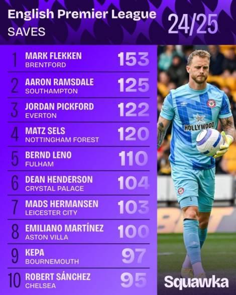 153次,弗萊肯是本賽季英超撲救次數最多的門將