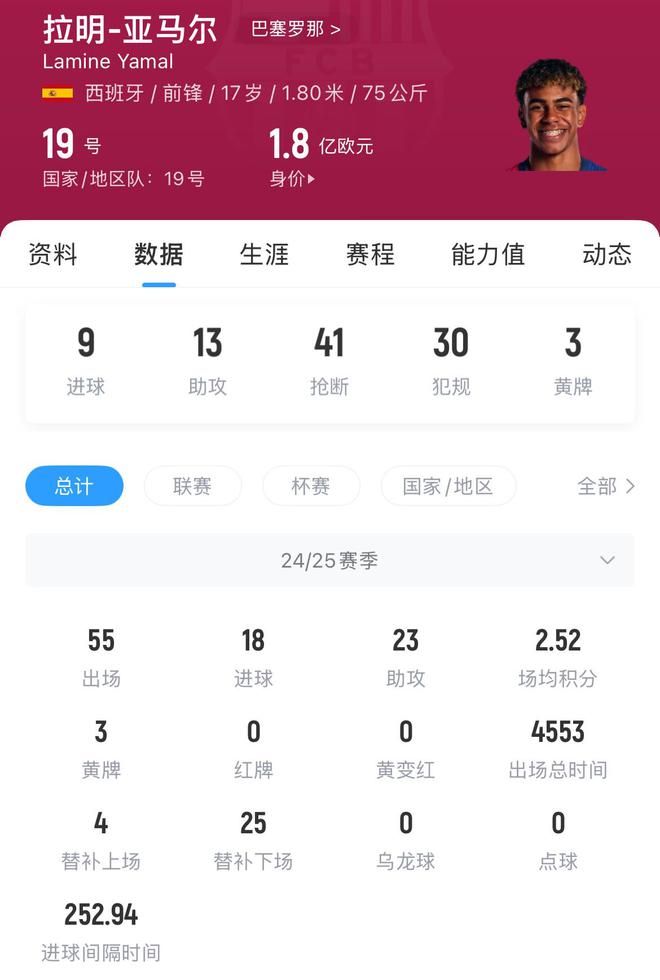 本賽季亞馬爾表現出色,為巴薩打進18球、助攻23次,幫助球隊拿下西甲冠軍、西班牙國王杯冠軍以及西班牙超級杯冠軍。目前其德轉身價已達1.8億歐元。
