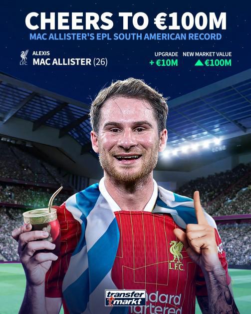 麥卡利斯特可以說(shuō)是本賽季英超最佳中場(chǎng),并在利物浦奪冠過(guò)程中發(fā)揮了關(guān)鍵作用。這位阿根廷中場(chǎng)因此獲得了1000萬(wàn)歐的身價(jià)提升,這也讓他達(dá)到了一個(gè)非常特殊的里程碑。