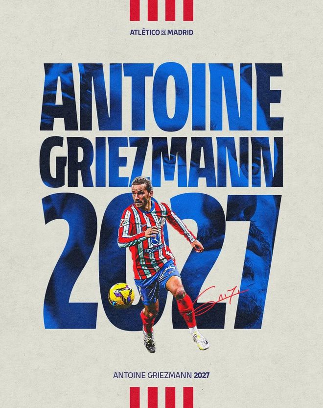 馬競官方宣布,與34歲的格列茲曼續約至2027年夏天。格列茲曼在2014年從皇家社會加盟馬競,經歷了兩段馬競生涯(2014-2019、2021-至今)。2019年夏天以1.2億歐轉會費加盟巴薩,效力兩個賽季后重返床單軍團。