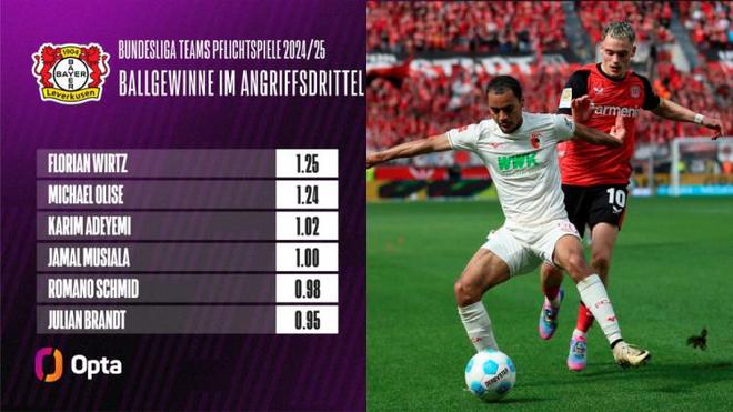 24-25賽季維爾茨進攻三區平均每90分鐘搶斷1.25次,德甲聯賽最多