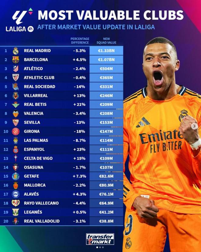 西甲球隊(duì)身價(jià)排行(括號(hào)內(nèi)為更新后變化幅度):