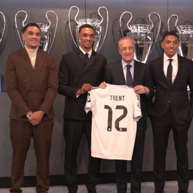 在亮相儀式上,阿諾德手舉自己的12號球衣亮相,并且與自己的兄弟們和弗洛倫蒂諾合影,球衣上印的名字為“特倫特(Trent)”。