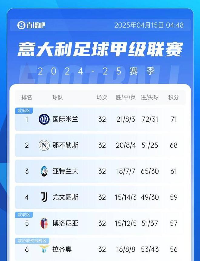 意甲積分榜:那不勒斯6輪不敗距榜首3分 國米仍領跑、尤文第四