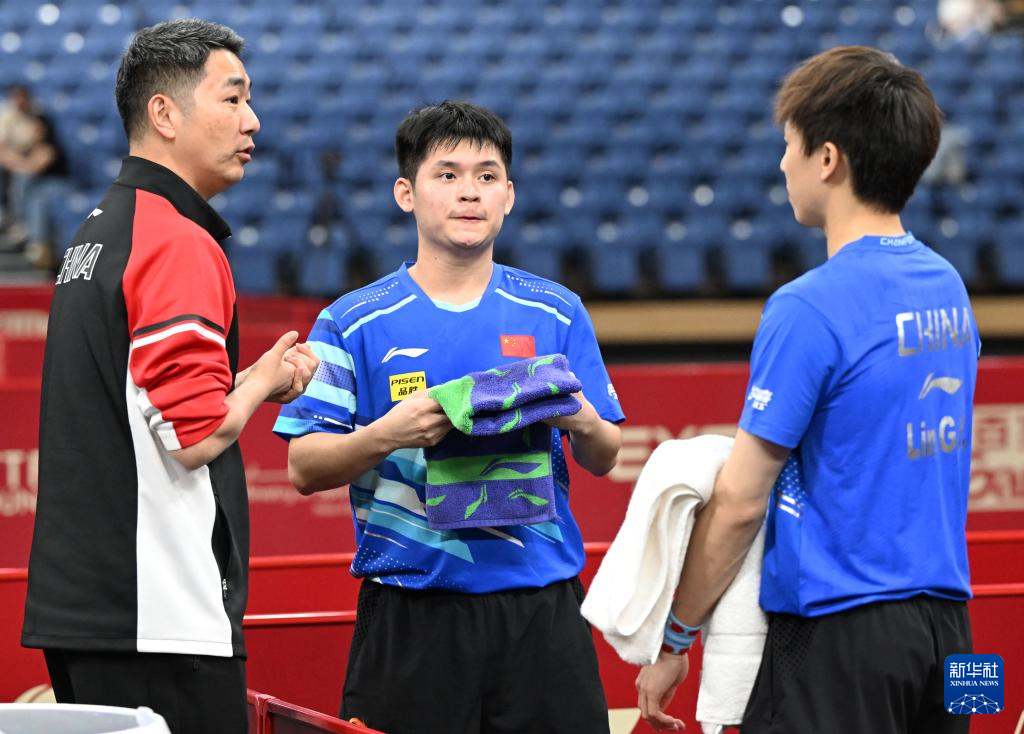 5月19日,林高遠(yuǎn)(右)/林詩棟(中)在比賽間隙接受教練指導(dǎo)。