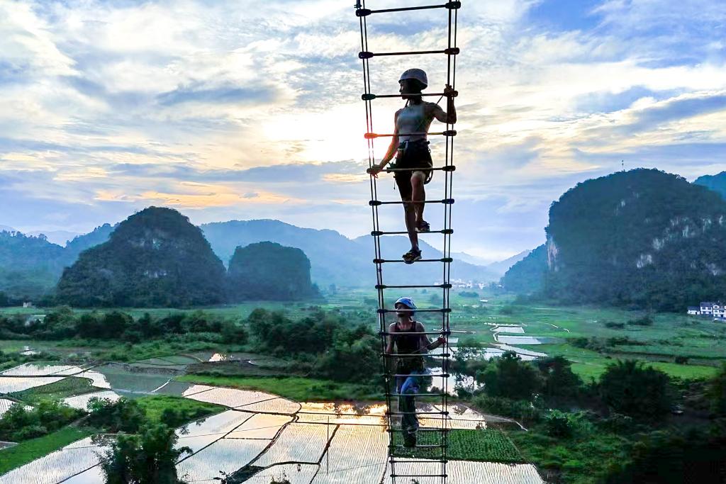 ↑攀巖愛(ài)好者在廣西桂林體驗(yàn)攀巖