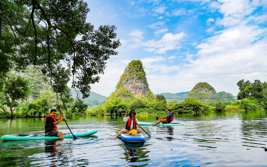 ↑游客在廣西桂林劃槳板。體育日?qǐng)?bào)記者 胡星宇 攝